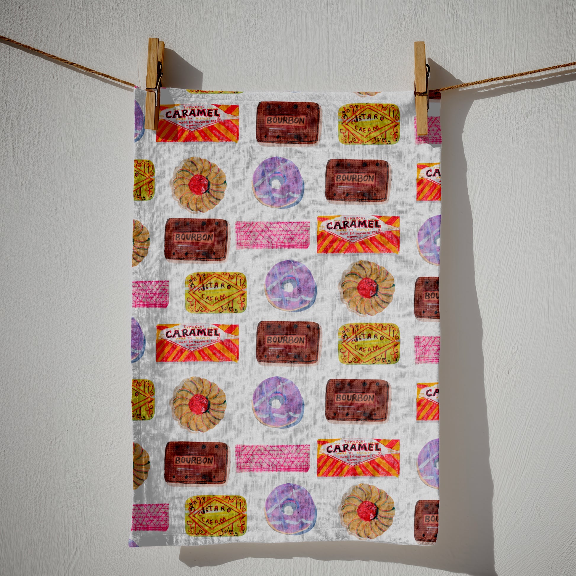 Sweet Treats Organic Cotton Tea Towel. Which biscuit would you pick to savour with your cuppa? Featuring hand-illustrated classic biscuits and their iconic packaging, printed on soft, high-quality organic cotton.